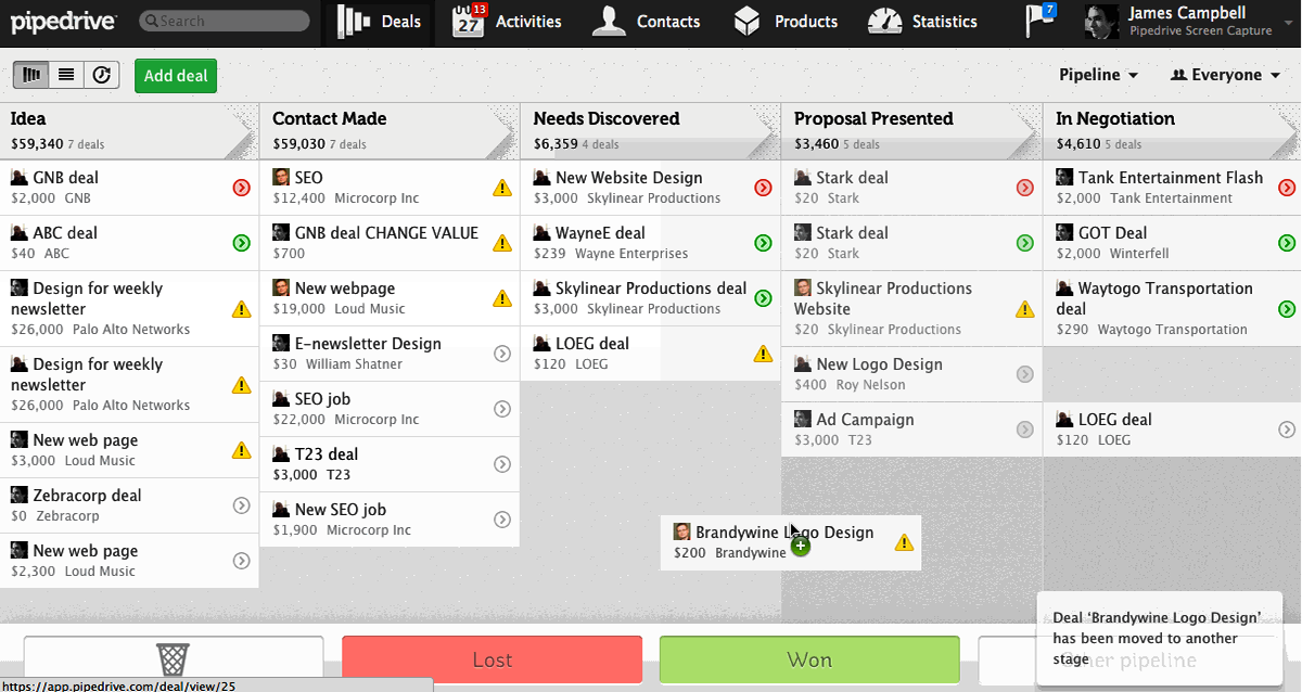 Pipedrive’s core strength lies in direct sales, which efficiently manages your company’s sales pipeline. The downright intuitiveness of the system helps you distinguish hot leads and priority deals, and develop an individual approach for each of them without wasting too much time. Negotiating a deal, or maintaining lead relationships in general is a fully flexible process, and you can quickly customize it to promote your brand or adjust the conditions you no longer agree with. Pipedrive allows you to switch on/off entire modules, and guarantees there will be no side effect on the quality of your service.