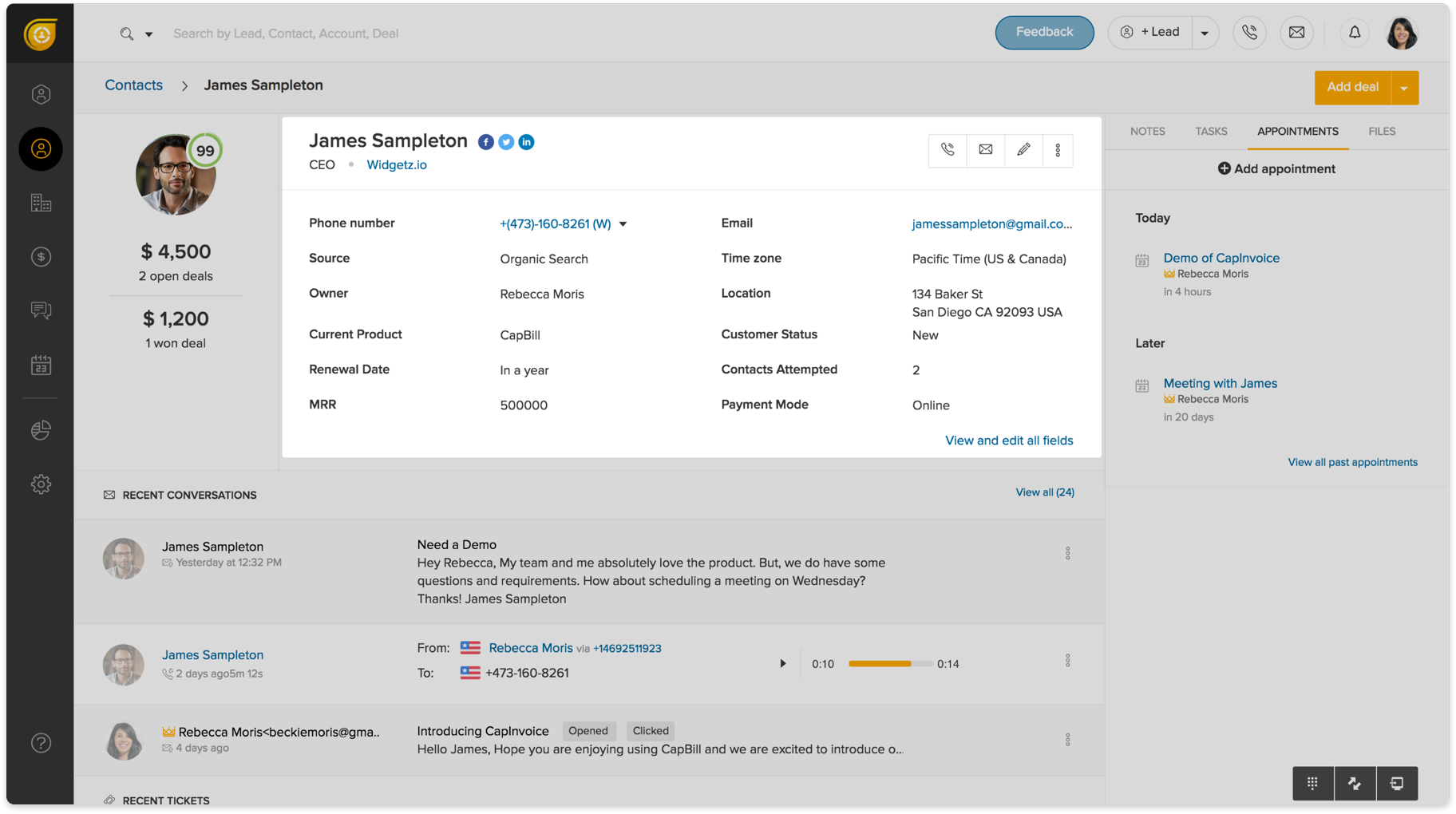Zoho lets you identify and target inactive leads with historical data to realign your customer messaging. Its Business Card View tool allows you to quickly access all pertinent customer information in one window without the need to scroll or search. The Notes Section displays the time and content of past conversations for a more personal and logical communication.