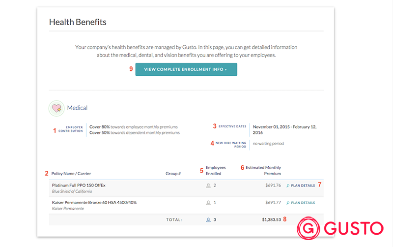 - Employees Enrolled: An overview of all employees enrolled per section, including the specific plans you offer and the employees included in each of them.