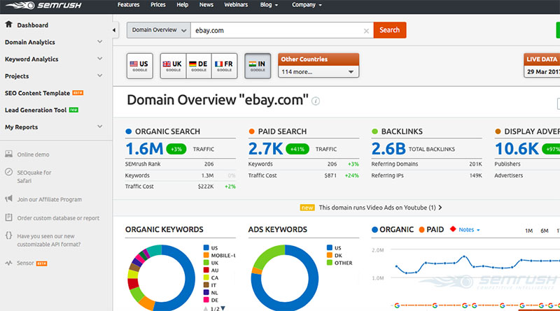 SEMrush ranks among the best business intelligence solutions for digital marketing campaigns. Its flexible pricing and diverse packages are designed to reduce business risk while maximizing your ROI. It has search engine optimization, pay per click, link sources, site audits, among other functionalities. Using the tool, you can easily compare competitor domain and keyword data and exploit vulnerabilities.