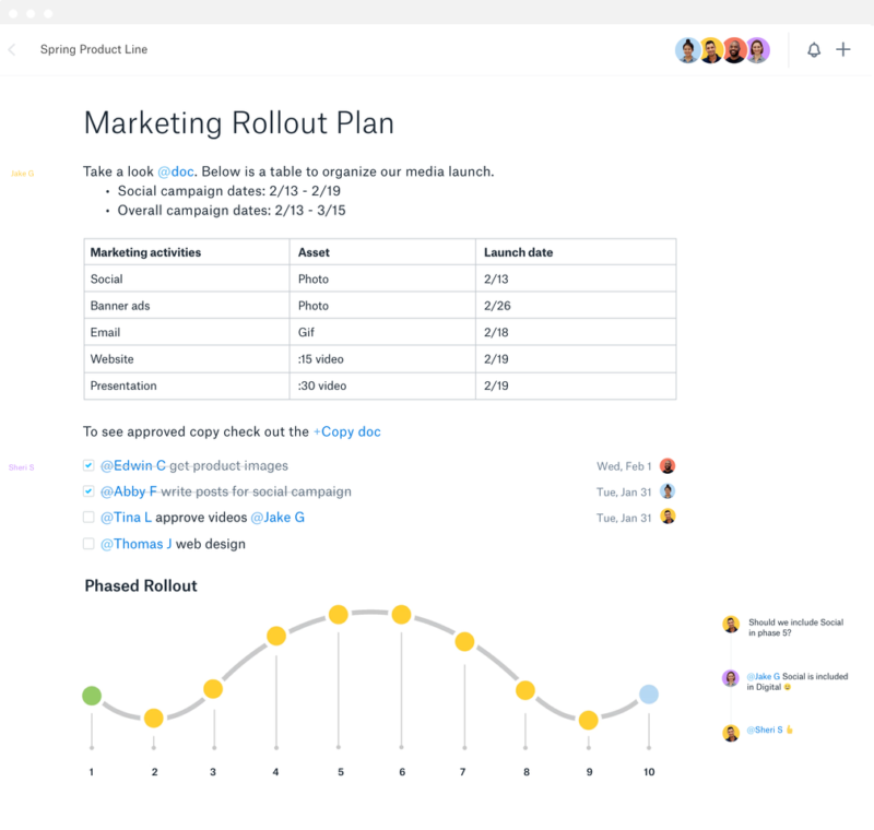 Collaboration tool Dropbox Paper is designed to enable corporate teams to create documents, assign tasks, share and edit files simultaneously. This platform is fully loaded with functionalities needed for tasks that require teamwork. The software has a simple interface, making it easy to use. If you need to format your document, Dropbox Paper offers a basic formatting feature, that allows users to embed images and put in code.