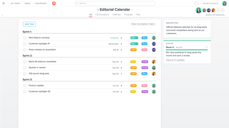 Popular project management platform Asana provides users with opportunities for communication and collaboration. It can be utilized in the creation of projects/tasks within projects, while allowing you to monitor such tasks’ progress from any browser and device. One can even add team members to projects and files aside from being able to share files.