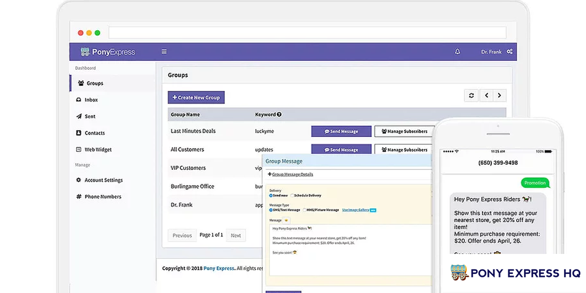 Text messaging application Pony Express HQ is an easy to use and convenient solution for communicating with customers on the platforms of your choice. With Express HQ, users are able to effortlessly send messages by bulk, or even to all of their contact groups. Because of this, you are able to deliver important information, product deals, alerts, reminders, and other pertinent information with ease. Individual replies can also be sent to address specific client requests and concerns.