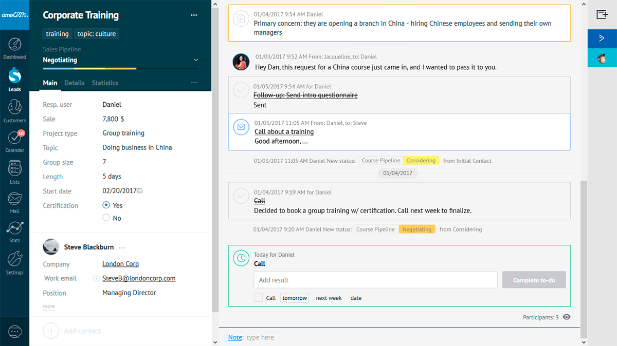 Businesses have taken notice, and amoCRM is quick on its feet powering up its CRM engine to latch on to the major global instant messaging platforms—Facebook Messenger, Telegram, WeChat, WhatsApp, Viber and Skype—through the use of chatbots, so the most minimal human intervention is required. That means your CRM contact and lead databank simply expands as you go along processing the most promising leads of the lot. It’s the intensive AI-way to implementing CRM, and amoCRM gets you there in no time.