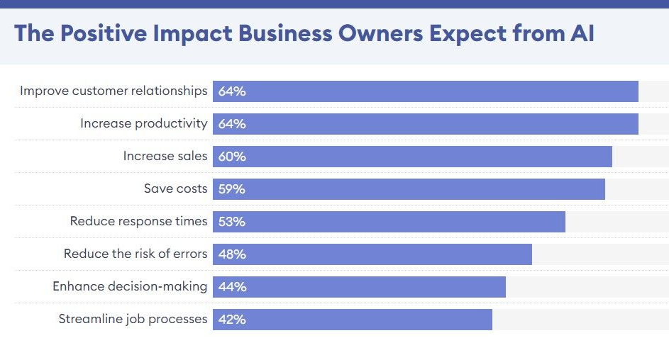It makes sense:AI is already smart enough to handle routine customer inquiries, allowing your personnel to concentrate on building customer relationships. Thus, Forbes Advisor reports that over 64% of business owners expect AI and automation to improve customer relationships and increase productivity in business operations.