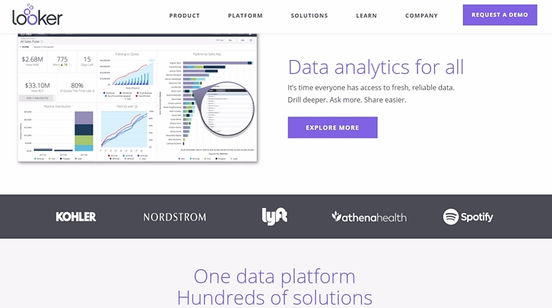 The BI platform can analyze both web-hosted and SQL information and accommodate over two dozen data variations including Hive, Vertica, and Google’s BigQuery. Likewise, you can design visualization using a single code and from there build more complex visualizations. Specifically, Looker can help in the following areas: