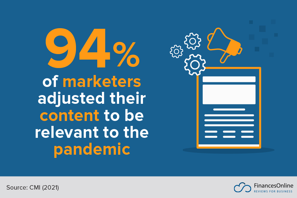 - 94% of marketers adjusted their content marketing strategy to maintain relevance to the coronavirus pandemic. (Content Marketing Institute, 2021)