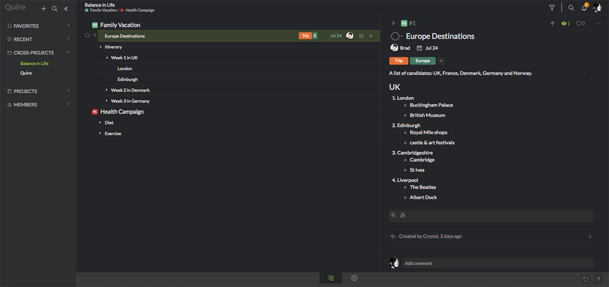 Quire is a free, modern task management app for creative teams. It lets you map out your big ideas, break them down into small steps, and tackle them one by one with your team. The system aims to reduce the burden of managing complex and time-consuming projects by simply breaking those into smaller and more manageable units, and letting teams prioritize between them in any preferred manner. Rather than being exclusively focused on function, Quire also pays attention to form, which is why it offers one of the best-organized and easiest to navigate interfaces in this industry.
