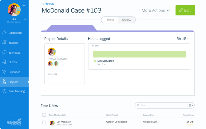 One of users’ favorite FreshBooks features is time tracking, which they believe to be tightly connected with the hours they save on aligning accounting with other operations. The feature helps identify how each team member is spending his working hours, and hence pinpoint areas that consume the most time, and need improvement. Not even to mention that tracked hours are essential to pull off accurate invoices.