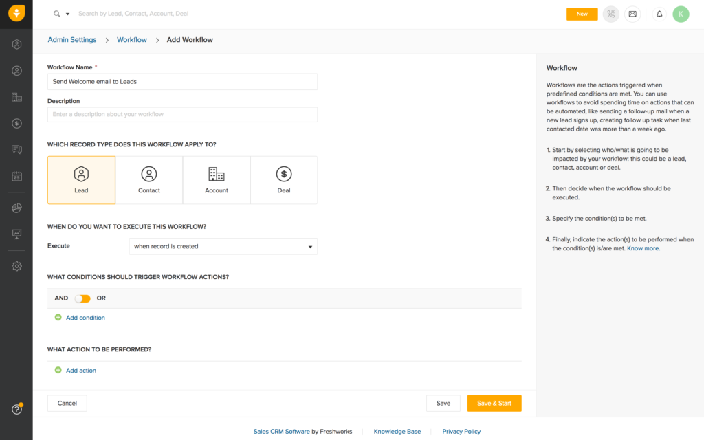 With Intelligent Workflows, users can create a workflow where the rule is able to look for triggers like updates to a deal status or the creation of a new lead. Upon trigger identification, actions defined by users like welcome email distribution, follow-up task creation and sending out notifications with the use of webhooks are automatically performed. One notable feature is user behavior tracking within your website, which provides great insights.