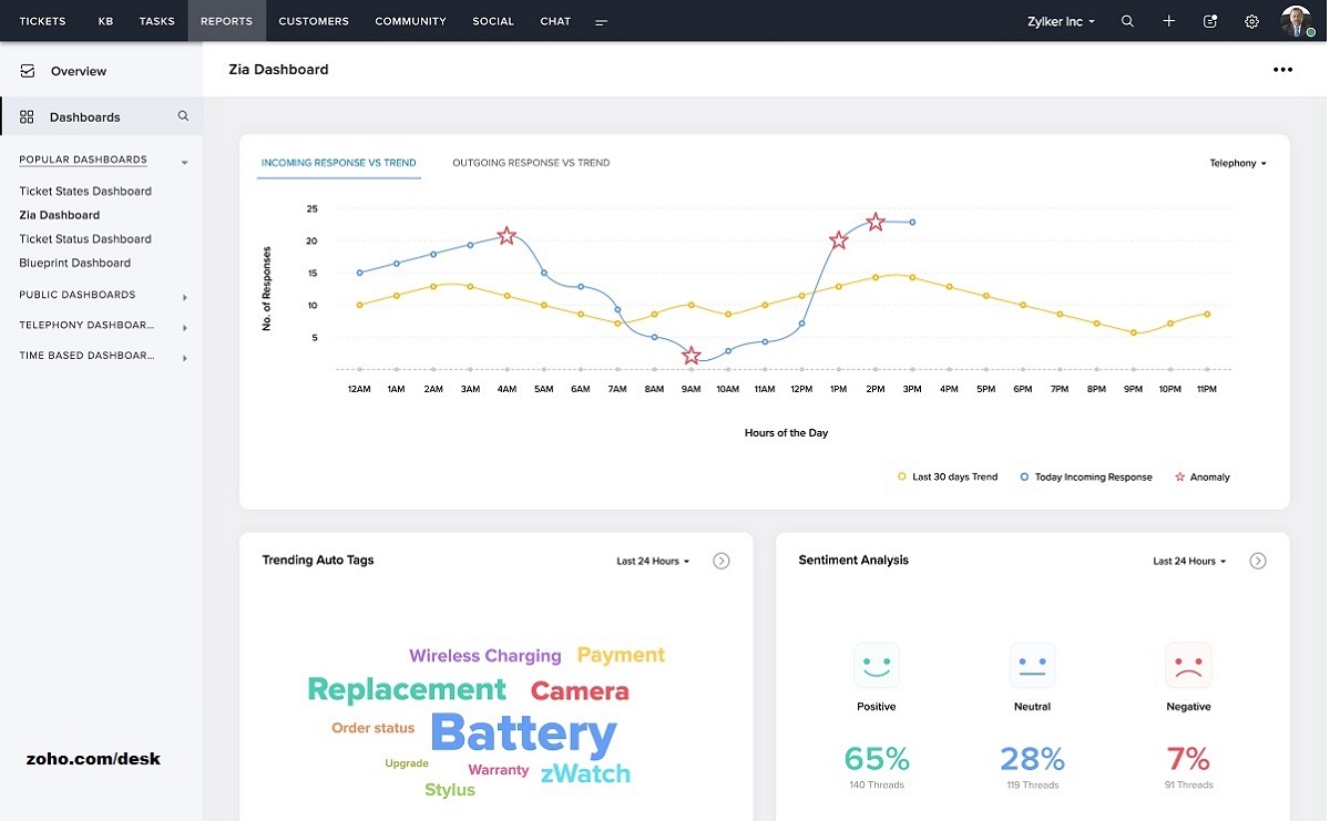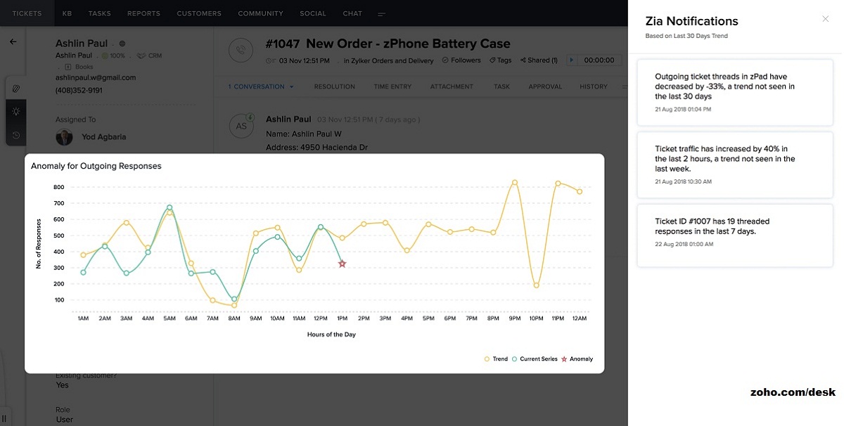 The benefits of integrating AI software in customer service have gone beyond assisting and interacting with customers. AI assistants can now be equipped with tools for analytics that supply customer service teams with useful data for performance improvement or resolving internal problems. For instance, Zia can detect if there are irregularities in the customer service metric system. These anomalies, such as irregular ticket traffic, are immediately reported by Zia not only to the agents but also to the managers.