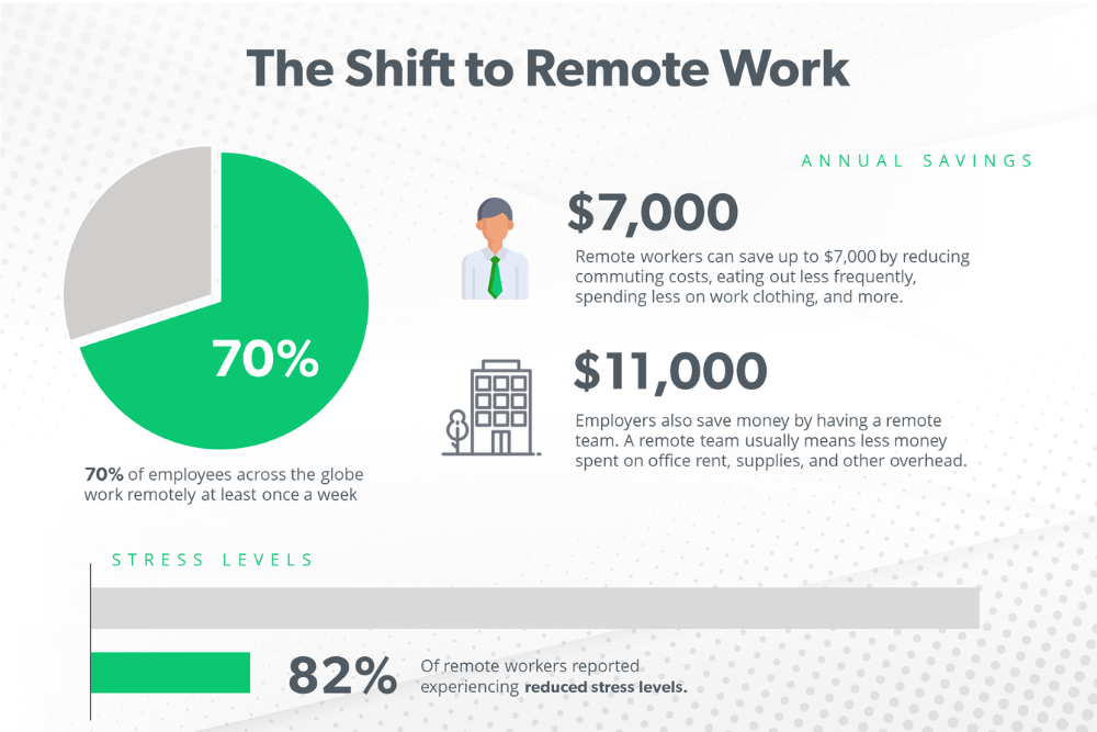 Another great thing about remote work is that it saves employees and companies money commuting to work and traveling for business. Employees who travel to the office daily spend a lot on gas, parking, and tolls.