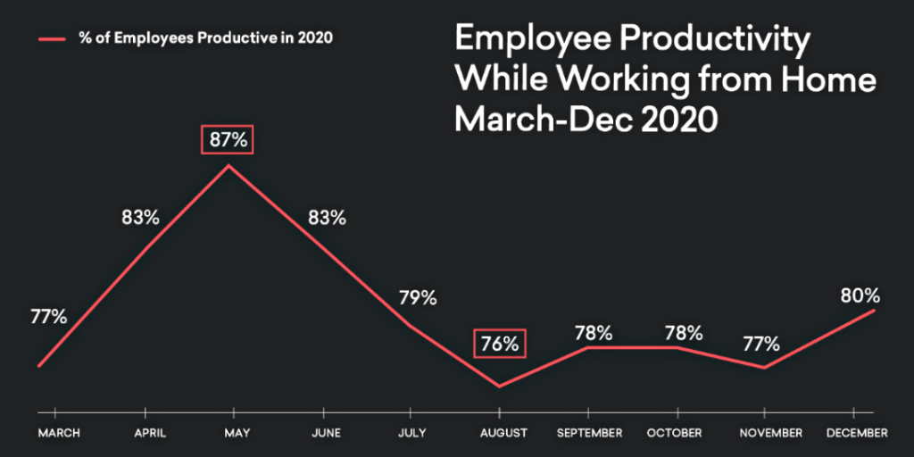 When managing remote workers, efficient employee time tracking and payroll processing methods are more important than ever, especially when the majority of your workforce may be working away from an office environment. This is where employee time clock software could be the solution. While there was an initial productivity boost for those who switched to working from home during the start of the COVID-19 pandemic, during the summer, this dipped substantially, with many claiming poor leadership was killing remote work productivity. As you can see from the data below, remote work performance suffered from May through to August 2020, only slightly picking up at the start of September. But rather than blame work-from-home distractions such as family, pets, and Netflix, it was a lack of leadership and remote work management in the firing line. Which is why there is a growing need for remote work performance software such as time-tracking and clock software.