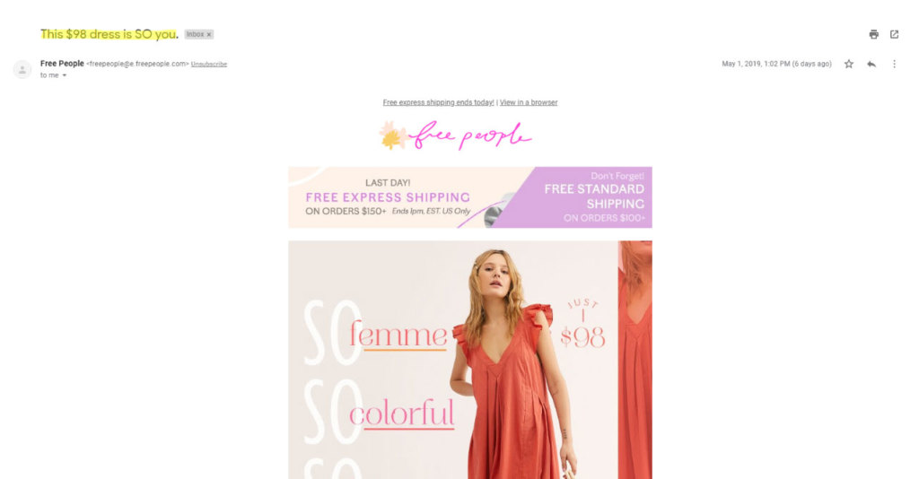 Take this email for example. Now, the most common way to promote a dress would be to go for something like “new summer dresses” or “dresses you will love”. But this free people newsletter here chooses to personalize its subject line so that it arouses the readers’ curiosity and feels so personal you could almost think you were the only recipient. Plus, includes the price to make it even more attractive.