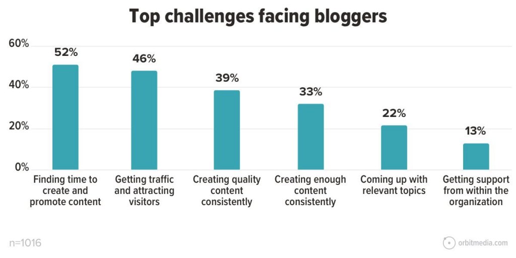 When you’re creating content, time is of the essence. Building a 2000-word blog from scratch can take anywhere between 4 and 6 hours (even more, if it requires in-depth research and expertise). So, if you have to scale content creation, it all comes down to balancing quality with quickness. That’s where the biggest challenge lies. In fact, an Orbitmedia report says that finding the time to create and promote content is the top challenge for 52% of bloggers.