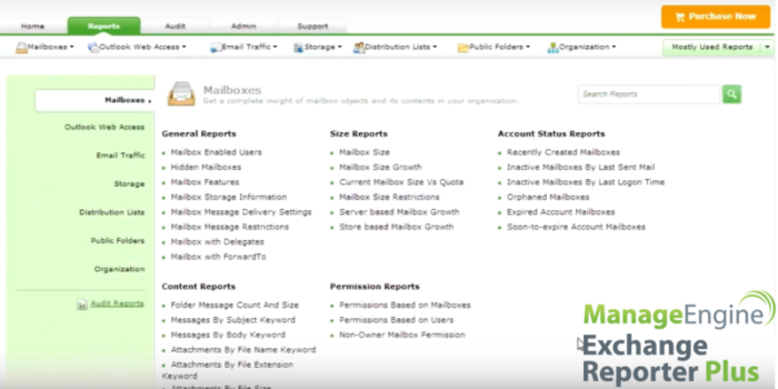 Exchange Reporter Plus is a solution that can analyze and supervise your need to efficiently manage your email communication infrastructure. It is an Exchange reporting solution that can equip your Exchange Administrator with precise, granular, and actionable data on various aspects of MS Exchange Server.