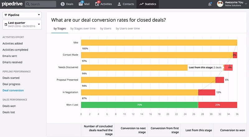 Pipedrive is a highly-ranked and multi-awarded CRM and sales pipeline management software. Among its many robust features is it’s simple but effective Sales Reporting which comes hand in hand with the Statistics functionality. The latter provides you critical metrics so you can follow the performance of individual agents, the value of each separate deal, or the history of every lead. It also allows for vital comparisons such as between closed and lost deals.