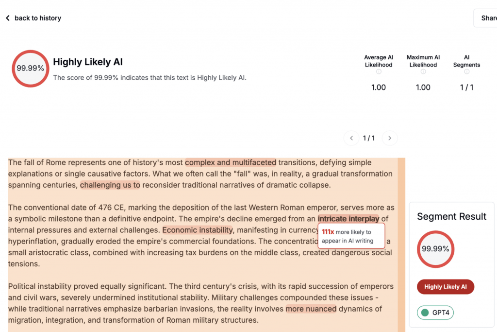 The platform’s primary differentiator is its segment analysis capability. Rather than assigning a binary human or AI label to an entire document, Pangram breaks the text down sentence by sentence. This allows users to visualize exactly which parts of a submission are original and which are synthetic, providing the necessary context for fair adjudication in academic and professional settings.