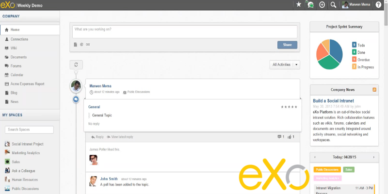 The software connects to LinkedIn, Facebook, or Google + allowing you to link up to the social feeds of members right away. For privacy concerns, members can also create a software-specific account. eXo Platform creates a social graph and activity streams related to the project.