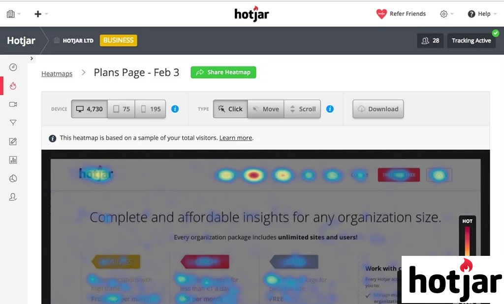 Hotjar offers various plans to suit any user’s needs. It even has a free plan for individuals and sites with low traffic volumes. Unlike other tools that capture data according to data points, Hotjar uses “sampling” or distributing data collection throughout the day automatically. If you exceed the page limits of your plan, you can either upgrade or delete items.