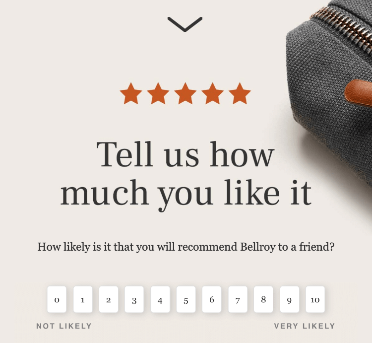 You can even start simple. Collect ratings via your email campaigns like Bellroy does and display them on your website or use them in marketing collaterals to build trust.