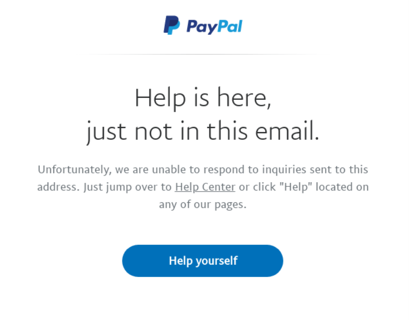 To make it easy for customers to your email address, add it to the footer of your website. Also, make it easy to remember, like support@yourbrandname.com. However, if emails are sent to the wrong address, have a template ready to redirect them to the correct account. PayPal does this exceptionally well with a short yet effective email.