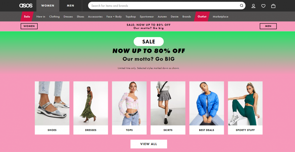 The next step is to keep your customers engaged. Craft your website to align with visitors’ interests and make navigation effortless to reduce bounce rates. ASOS does this extremely well. They have headers for easy navigation and dedicated categories for quick navigation.