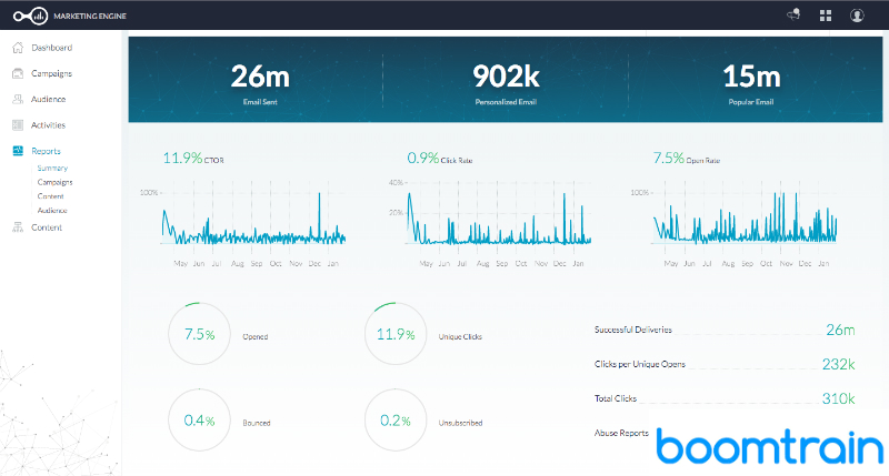 Boomtrain utilizes artificial intelligence to analyze web content and provide detailed insights on user behavior from mobile apps, email, websites, and other touch points. Businesses can utilize the insights to personalize and improve customer experiences on all channels in a cost-efficient manner. You can use this marketing automation platform to deliver relevant messages in real time, at any scale, via any channel. In addition, you can market your products and services to your target audience with marketing template customization, customer and profile tracking, and cross-channel marketing automation. This allows you to deliver personalized customer experiences and elicit desired behavior. Large companies that need complex analyses of marketing data can get quote-based enterprise pricing for the features they use. For more good options, browse these Boomtrain alternatives here.