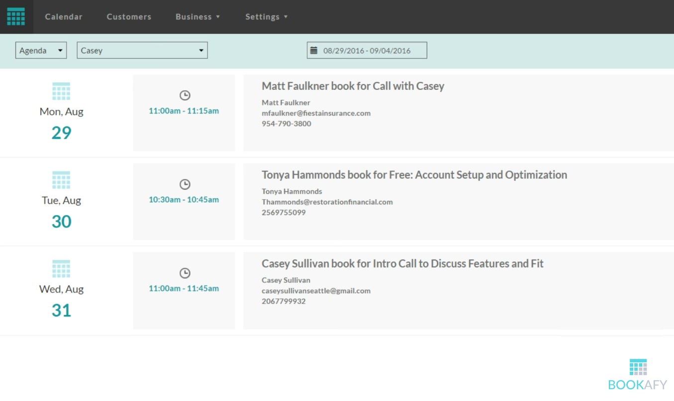 Bookafy is an easily navigable appointment scheduling solution that gives professionals the power to manage business activities more efficiently. Offering 24/7 access via tablet, computer, or smartphone, this software is equipped with robust scheduling tools that make it easy to check any conflicts in your calendar, confirm appointments, and send automatic reminders for upcoming appointments. This way, it is easier for you to stay on top of your schedule at all times. In addition to helping businesses stay on top of their schedules, Bookafy also has a simple-to-use customer portal that allows your clients to book appointments without having to contact your office.