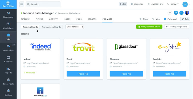 Recruitee offers an intuitive design and you can use it to streamline your hiring operations and manage your employees more efficiently. The app is utilized by more than 600 companies including top brands like Red Bull, Vodafone, Peerby, and Evbox. The notable aspect about its interface is it is fully customizable and brandable. You can create custom pages for each job opening. Another advantage is you don’t need to create job descriptions from scratch as you can make use of a library with more than 200 description templates for different positions. Candidates can apply by either filling the online application form or by linking their LinkedIn or Indeed profile. If you are looking for a wider choice, here are some good Recruitee alternatives.