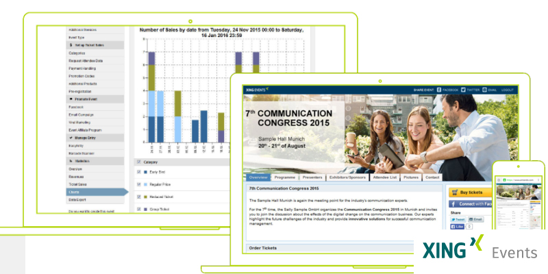 XING Events also has real-time reporting that helps you monitor event traffic, sales, and other key metrics. You can anticipate potential issues at once, such as cancellations or missed quotas, and implement the appropriate measures like changed venue or event postponement.