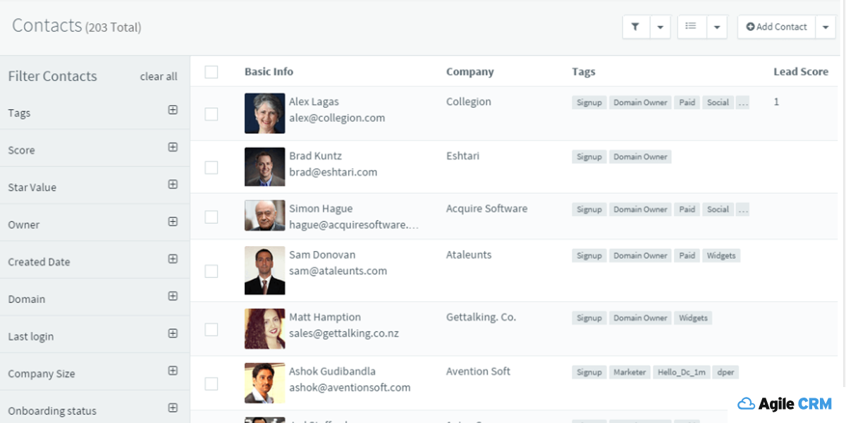 Agile CRM is built to accelerate operations of marketing and sales teams on a unified platform while ensuring user efficiency at every touch point with leads, prospects, and customers. Essentially, it enables businesses to close much more deals and generate more earnings. It comes equipped with lead scoring, marketing automation, automated custom workflows, email tracking, project management, contact management, web forms, push notifications, and help desk tools, to name a few.