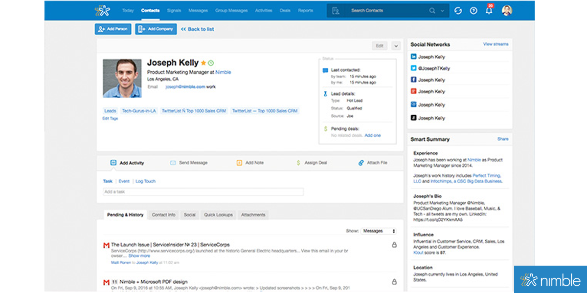 Nimble is a good choice for businesses looking to streamline customer engagements and automatically collect customer data across various platforms for contextual interactions with minimal manual data entry. The platform automatically updates pertinent client information from various data sources such as Gmail, Yahoo, Outlook and social media channels, ensuring that you not only have rich information on each contact, but also allows you to get a clear view of their interaction with your company. Equipped with this information, you can easily discover their interests, history, and other information that will enhance your interaction while tracking all deals and preventing leads from going cold. Moreover, you can engage customers on various platforms from within Nimble.