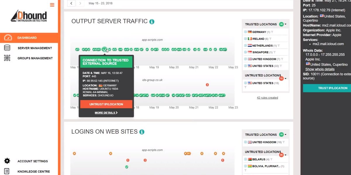 Dhound is primarily designed to keep your business information safe and secure from malicious threats. This intrusion detection software keeps a watchful eye on all events that occur on your servers and applications and provides you with a clear view on all individuals that are accessing your system. If an unauthorized user accesses your data, you can immediately halt outgoing traffic to quickly prevent data leakage. Whitelisting is also available to avoid being mistakenly alerted by false tags.