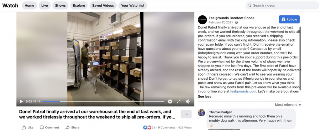 Showing behind-the-scenes seems to work the best through video content. For instance, Feelgrounds Barefoot Shoes shared their behind-the-scenes video with their customers on Facebook which received amazing response and engagement. Not only they’ve successfully communicated how important their customers are that they even work through the weekend to fulfill their needs, but they’ve also created hype behind their newest product.